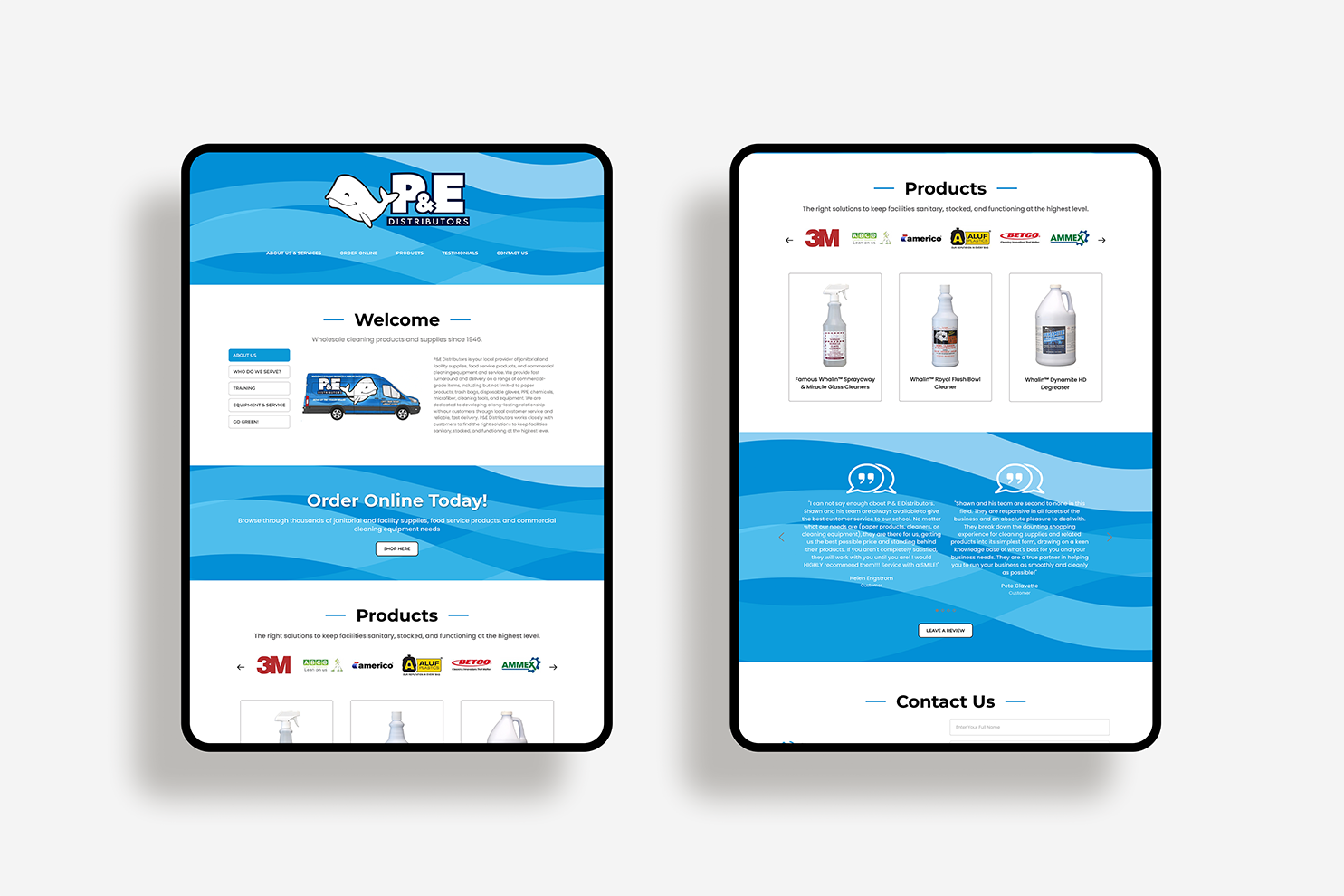 P&E Distributors is a janitorial, food service, and commercial cleaning supply distributor serving businesses across northern Maine. The company needed a website that could function as a digital storefront, allowing customers to quickly understand available products, access the online ordering catalog, and contact the team with questions. VC Print rebuilt the site as a focused single-page website that consolidates essential information and creates a clear path from discovery to ordering, prioritizing product access, service visibility, and direct communication to help customers quickly find what they need.